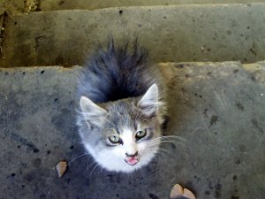 Подбросили 2-2,5 месячного пушистого котенка, бело-серого окраса.